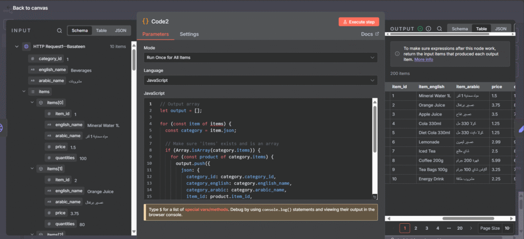 The Agent successfully retrieves and outputs highly detailed inventory data, including specific product categories (e.g., Beverages, Fruits), weights (e.g., 85 grams), and accurate pricing information (e.g., 5.25), eliminating manual data lookups.
