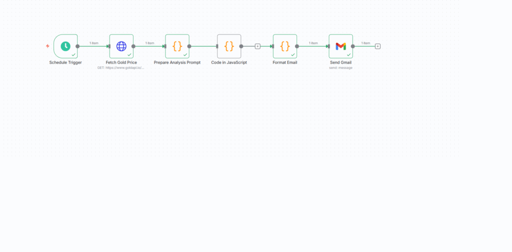 The workflow is designed to fetch data daily, or even be triggered immediately by significant changes in gold prices, offering a huge advantage for investment needs.